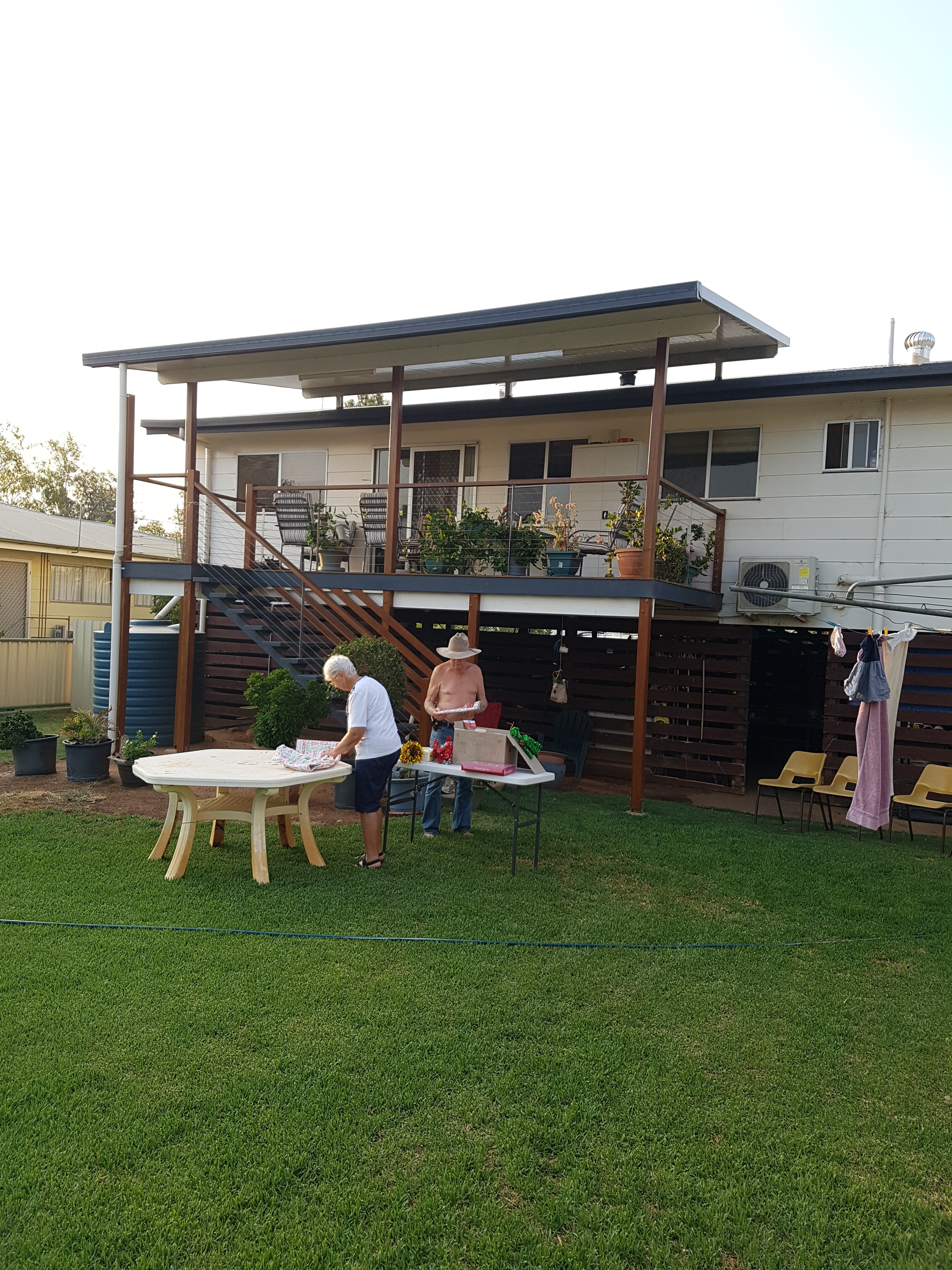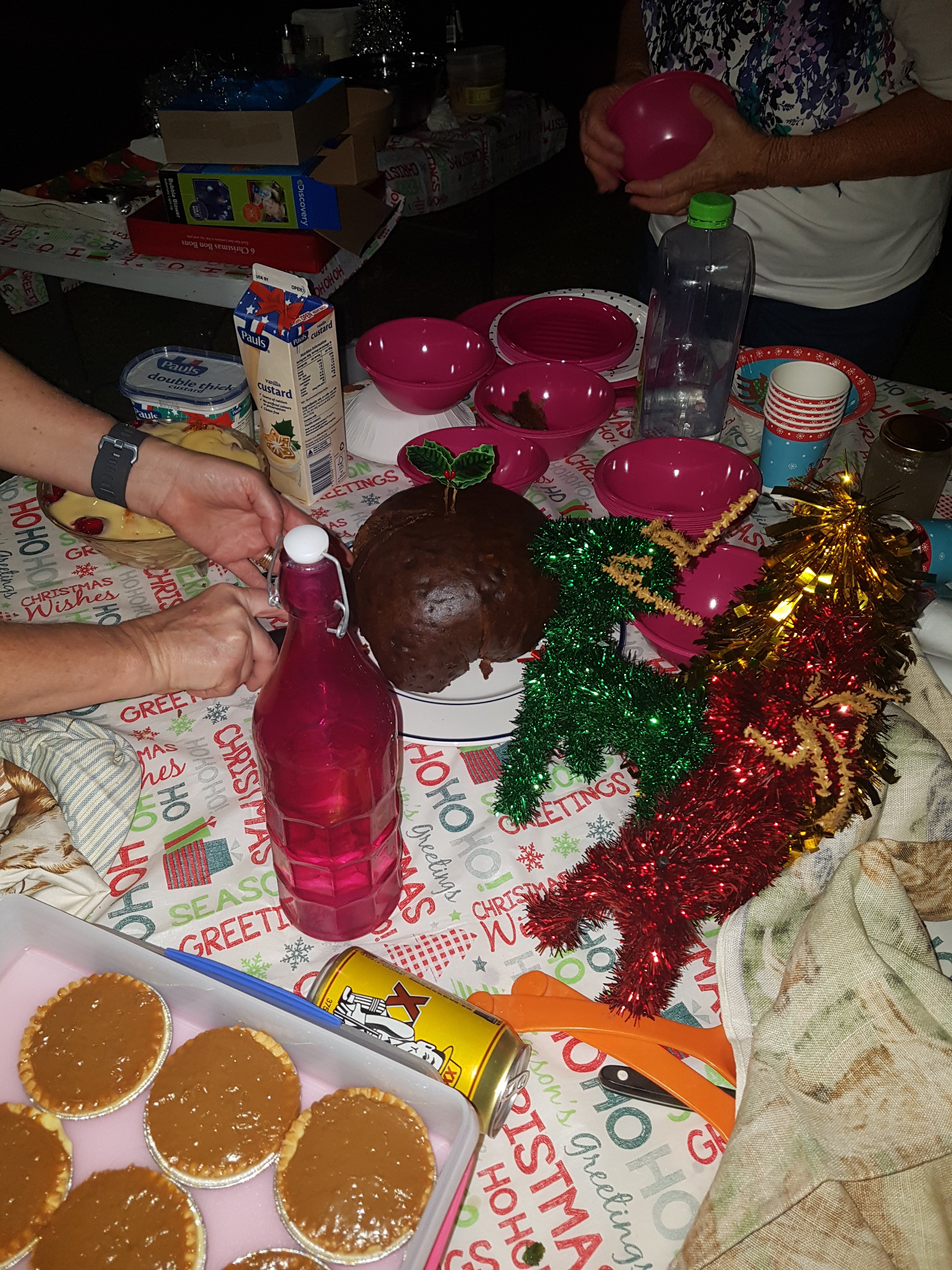 I did bake some bisquits but it’s simply not the same to do it in summer. I made a Christmas wreath but had to remind myself to light the candles because when it’s that hot you simply aren’t in the mood for candles, fire and hot wine. And on Christmaseve nothing is basically happening, due to Santa coming in the night between the 24th and 25th. So in the morning of the 25th we woke up and ate some brekki, then we went to the Christmastree and unwrapped the presents. Whitney practically unwrapped everyones present and handed it to us after. Then we packed our stuff and hopped into the car to drive to Dan’s parents place in Charleville. Where after lunch and more presents we all lay down for a nap. Later on we prepare tables and chairs in the garden as three siblings of Dan with their partners and kids were arriving. More presents were exchanged and than we dug into the delicious salads and meat. It was a festive and relaxed atmosphere. As desert plumpudding, caramel tarts and trifle was severed. Later on, satisfied and still full we went to bed.