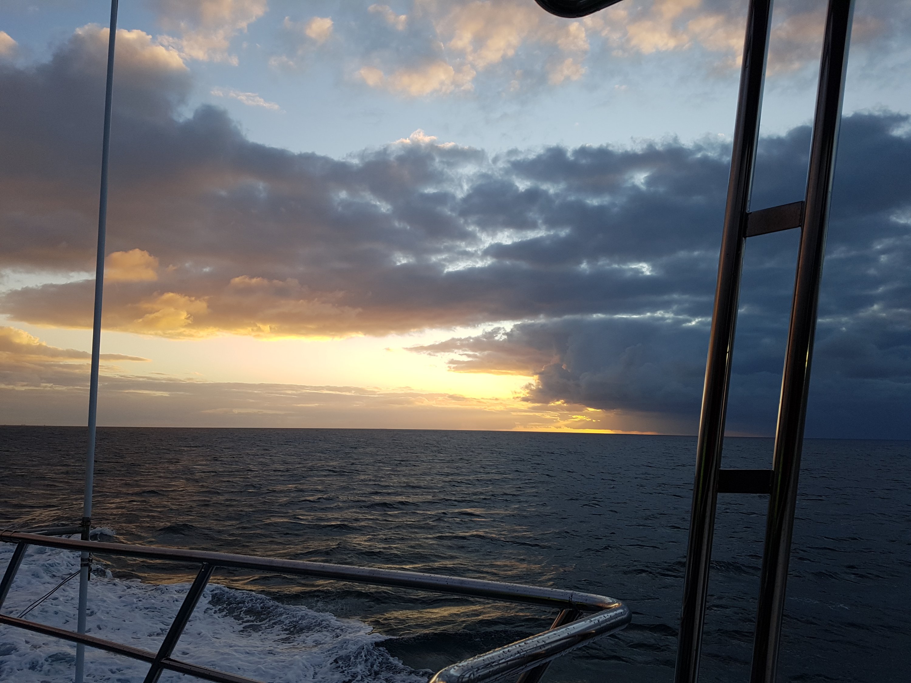 Mein Alarm weckte mich um 6 Uhr morgens und als erstes nahm ich mal eine Tablette um – hoffentlich – nicht seekrank zu werden. Dankbar, dass ich die Nacht in Port Lincoln verbrachte, war ich nach kurzen 2 Minuten mit dem Auto auch schon beim Büro von Calypso Star Diving angekommen. Dort checkten wir ein und bekamen eine Boardkarte. Entlang der Marina gingen wir zum Boot und wenig später betraten 32 Adrenalin-junkies und 4 Crewmitglieder das Boot. Und los gings.