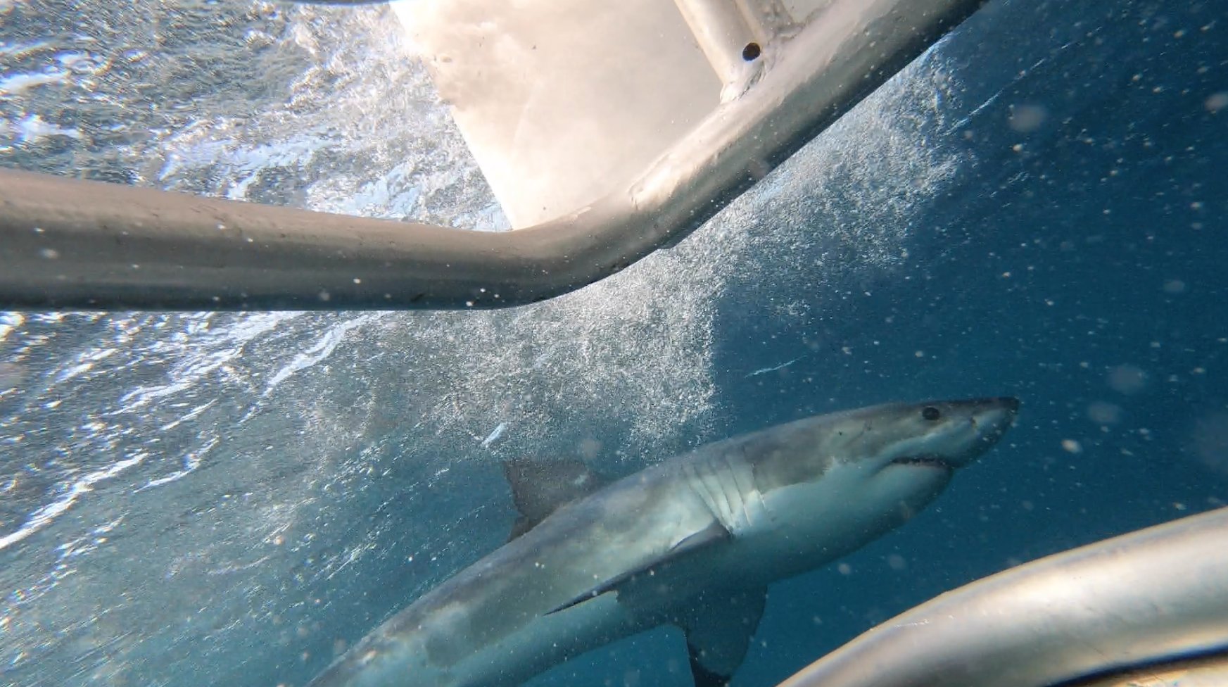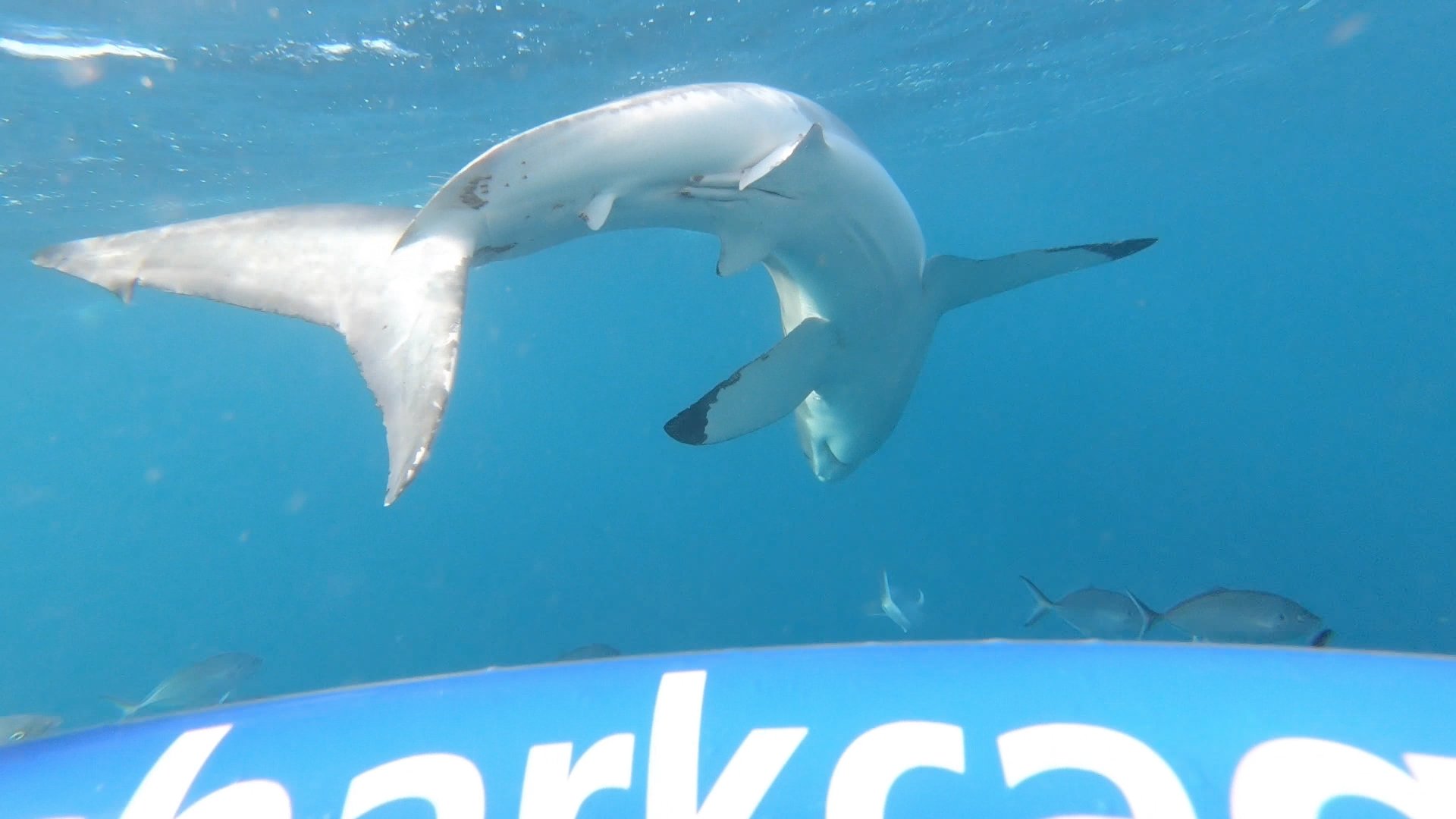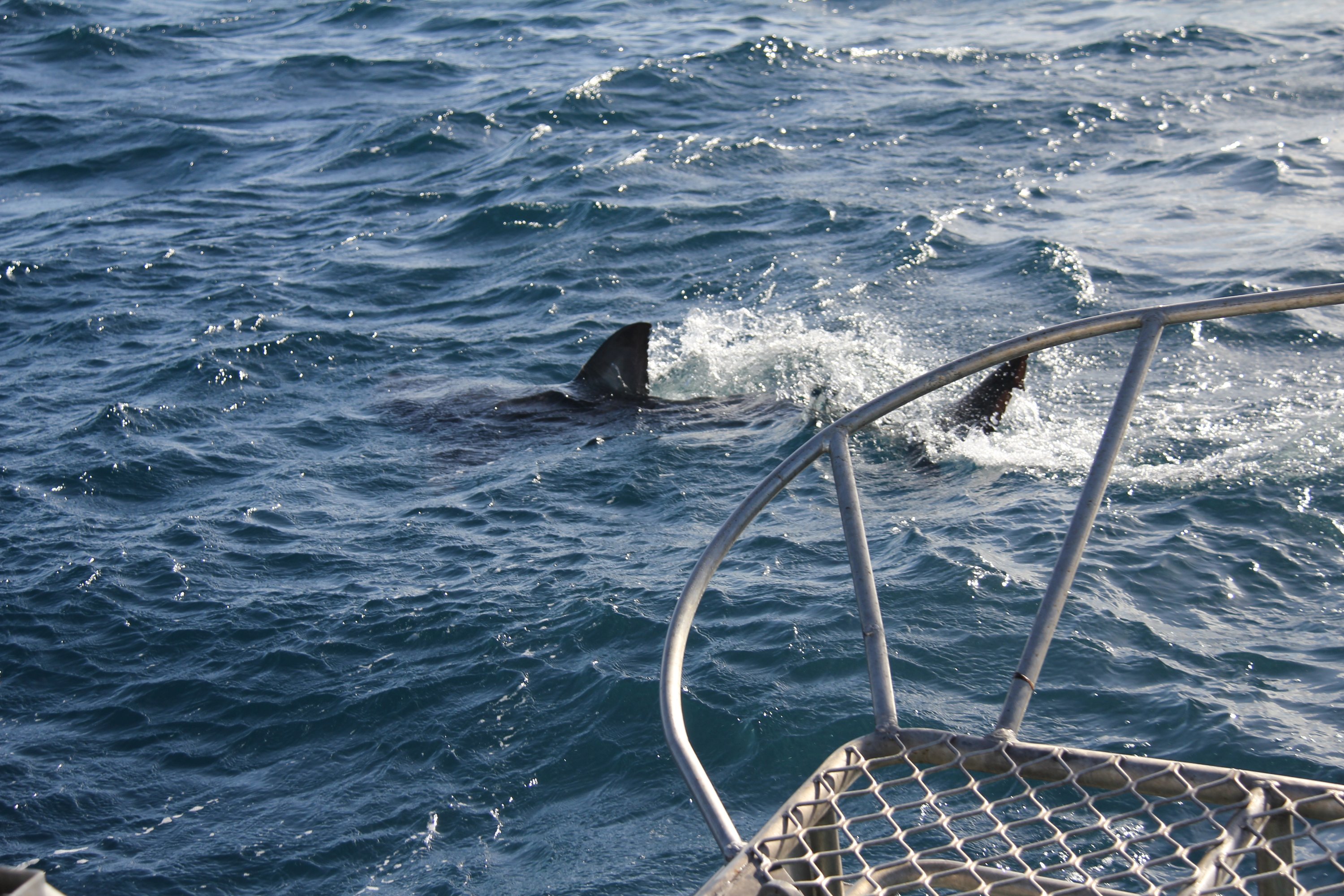 Als der Käfig ins Wasser gelassen und am Boot befestigt wurde begann das Warten. Die erste Gruppe ging dann auch schon unter Wasser. Pro Gruppe befanden sich dann acht Personen in dem Käfig unter Wasser. Das alleine ein Erlebnis für sich selbst. Der erste Hai lies auf sich warten und nach rund einer Stunde wurden die Gruppen gewechselt. Als dann die zweite Gruppe ca. 20 Minuten unter Wasser war sichteten wir das erste Hai Weibchen. Dann war meine Gruppe an der Reihe: Vorerst war ich erleichtert ins Wasser zu kommen bezüglich meiner Übelkeit. Doch noch 20 Minuten im Käfig hin und her geschaukelt zu werden musste ich mal meinen Magen erleichtern und machte stehend auf der Leiter des Käfigs eine Pause. Zurück aufs Boot gestiegen wurde der nächste Hai gesichtet und ich entschied mich nochmal unter Wasser zu gehen – und ich wurde nicht enttäuscht! Gleich zwei Haie interessierten sich für uns. Sooo aufregend. Es haben sich sogar zwei gezeigt. Die Haie fühlen den Puls der Menschen und sind neugierig was wir unbekannt Spezies in einem Käfig sind.