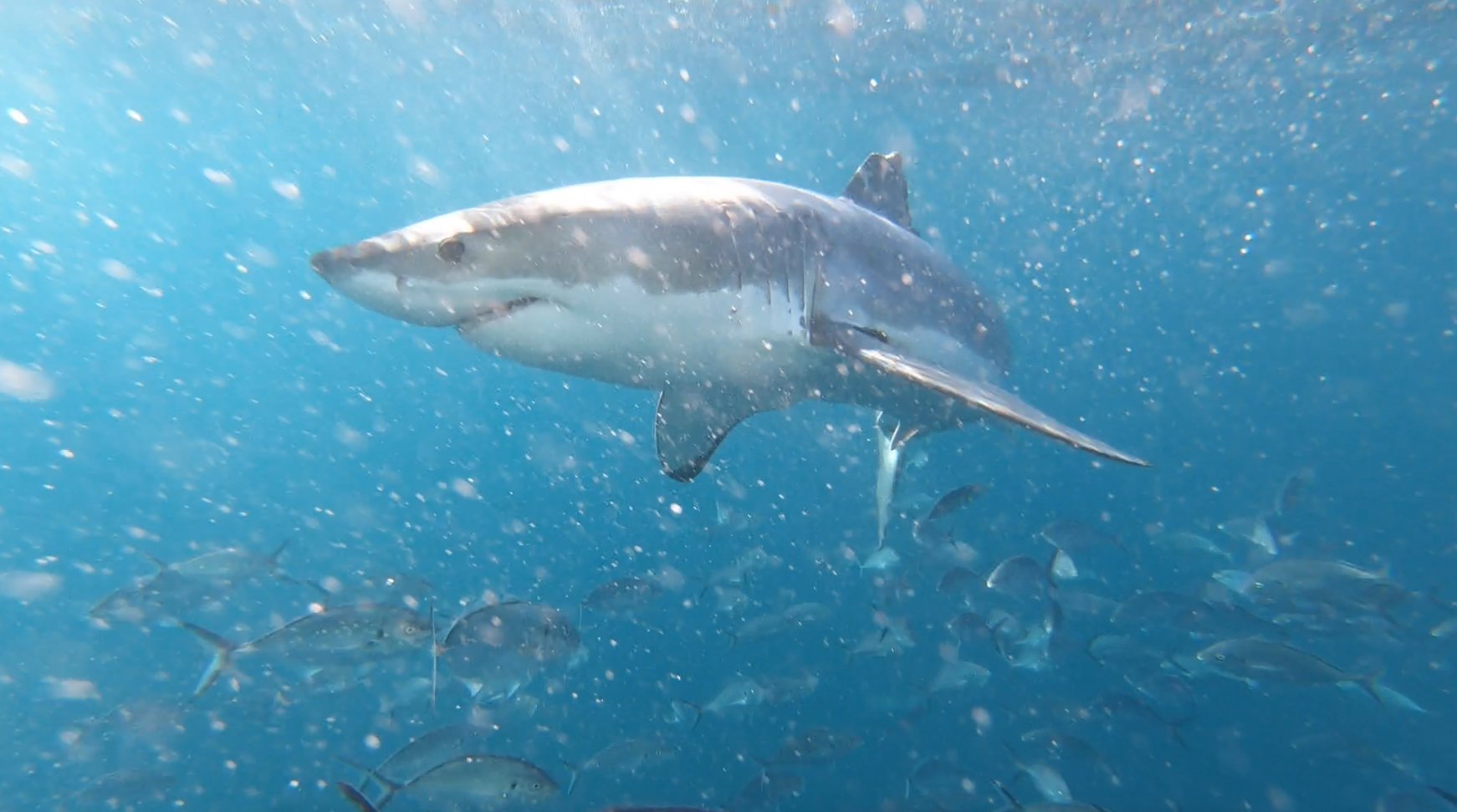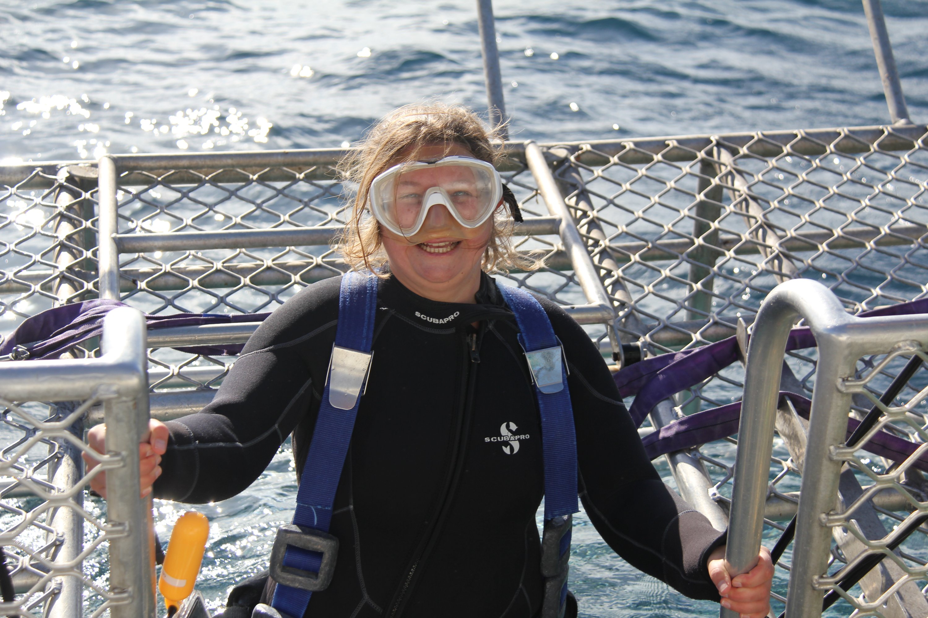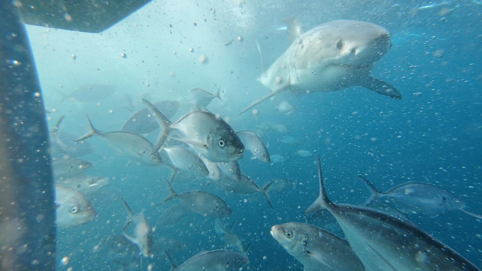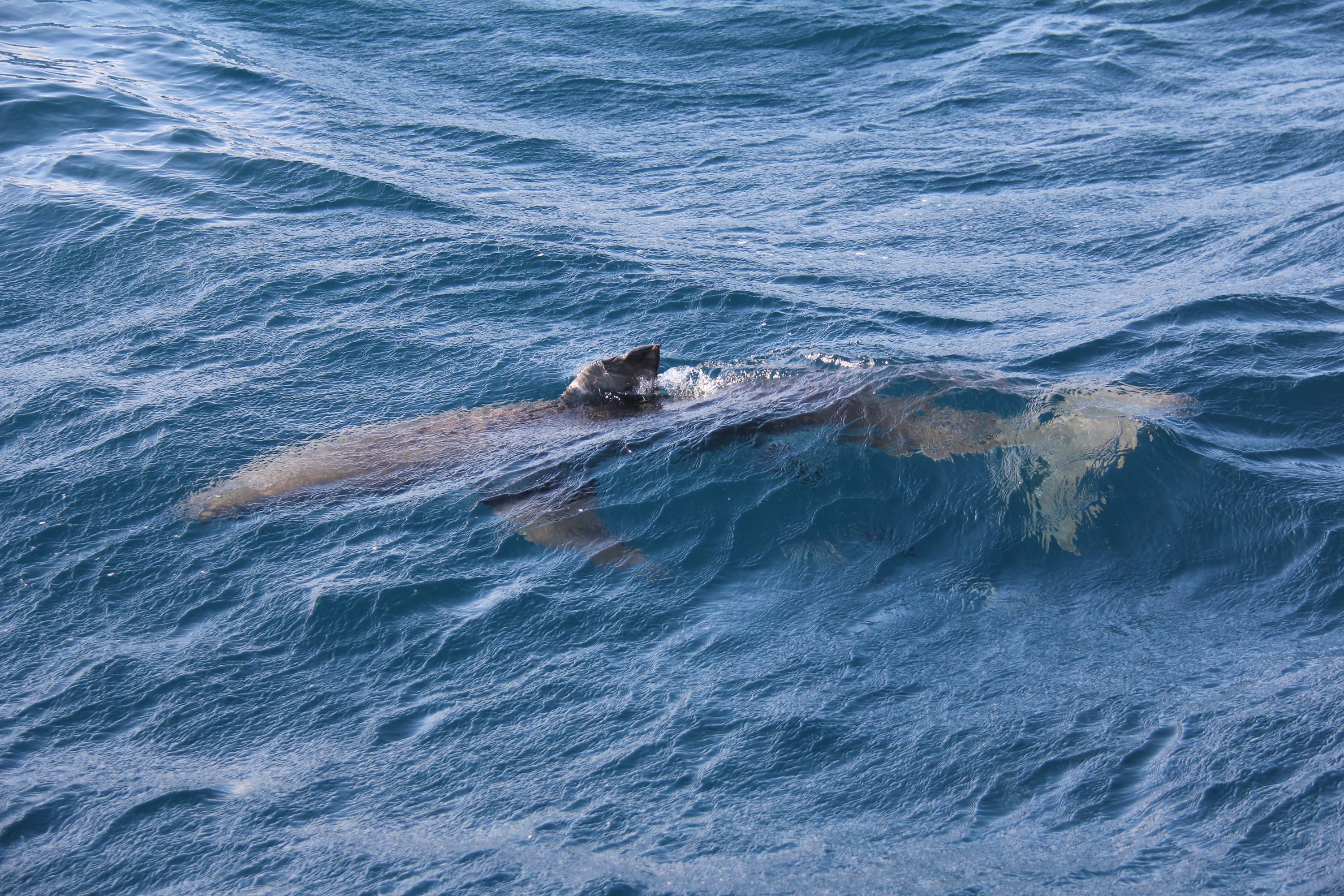 Als der Käfig ins Wasser gelassen und am Boot befestigt wurde begann das Warten. Die erste Gruppe ging dann auch schon unter Wasser. Pro Gruppe befanden sich dann acht Personen in dem Käfig unter Wasser. Das alleine ein Erlebnis für sich selbst. Der erste Hai lies auf sich warten und nach rund einer Stunde wurden die Gruppen gewechselt. Als dann die zweite Gruppe ca. 20 Minuten unter Wasser war sichteten wir das erste Hai Weibchen. Dann war meine Gruppe an der Reihe: Vorerst war ich erleichtert ins Wasser zu kommen bezüglich meiner Übelkeit. Doch noch 20 Minuten im Käfig hin und her geschaukelt zu werden musste ich mal meinen Magen erleichtern und machte stehend auf der Leiter des Käfigs eine Pause. Zurück aufs Boot gestiegen wurde der nächste Hai gesichtet und ich entschied mich nochmal unter Wasser zu gehen – und ich wurde nicht enttäuscht! Gleich zwei Haie interessierten sich für uns. Sooo aufregend. Es haben sich sogar zwei gezeigt. Die Haie fühlen den Puls der Menschen und sind neugierig was wir unbekannt Spezies in einem Käfig sind.