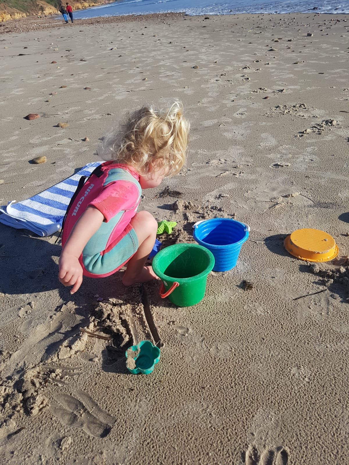 Saturday morning we wanted to go to the farmers markets but the rain beat us to it so instead we went to a bakery and headed home for a midday nap/rest for all of us. Mhmm, there is nothing more relaxing than a day sleep! And while I was sleeping the storm rolled away and I woke up to the most calm and serene day since we have been there. Warm sunshine, no winds – simply breathtaking. While Tara, Chris and Annabelle went to a wine tasting, Saxon, Harlee, Scarlett and I did what later turned out to be my highlight. Wetsuits on we went down to the beach and enjoyed. We ran through the waves, felt the tide coming in, build sandcastles, build a tower in the water (the aim was to make it stable enough so the next wave wouldn’t break it) and soaked up sunshine, laughter and digging our toes into the sand. The wetsuits were amazing and kept the kids nice an warm so we spent over an hour on the beach and in the water. Balanced, grounded and ourselves again we walked the steps back up and had a shower and a bath. As it was our last evening we all went out for dinner and enjoyed a deluxe meal. When we got back we packed most of our belongings. The plan: If the kids wake up early will hop in the car and drive off – if not we will stay at the beachhouse until midday and then drive off.