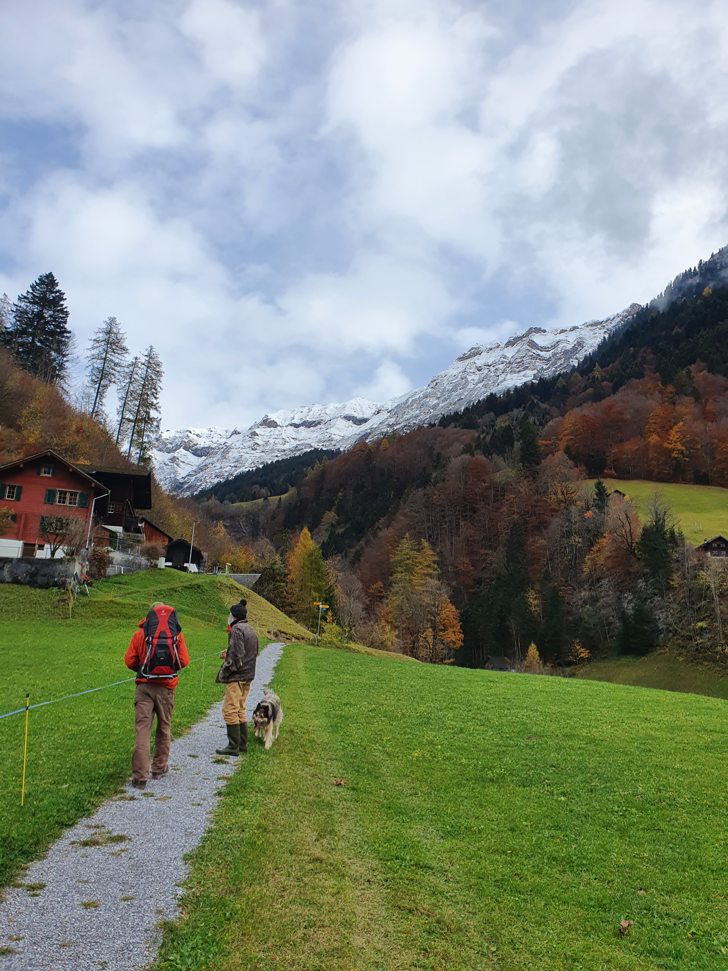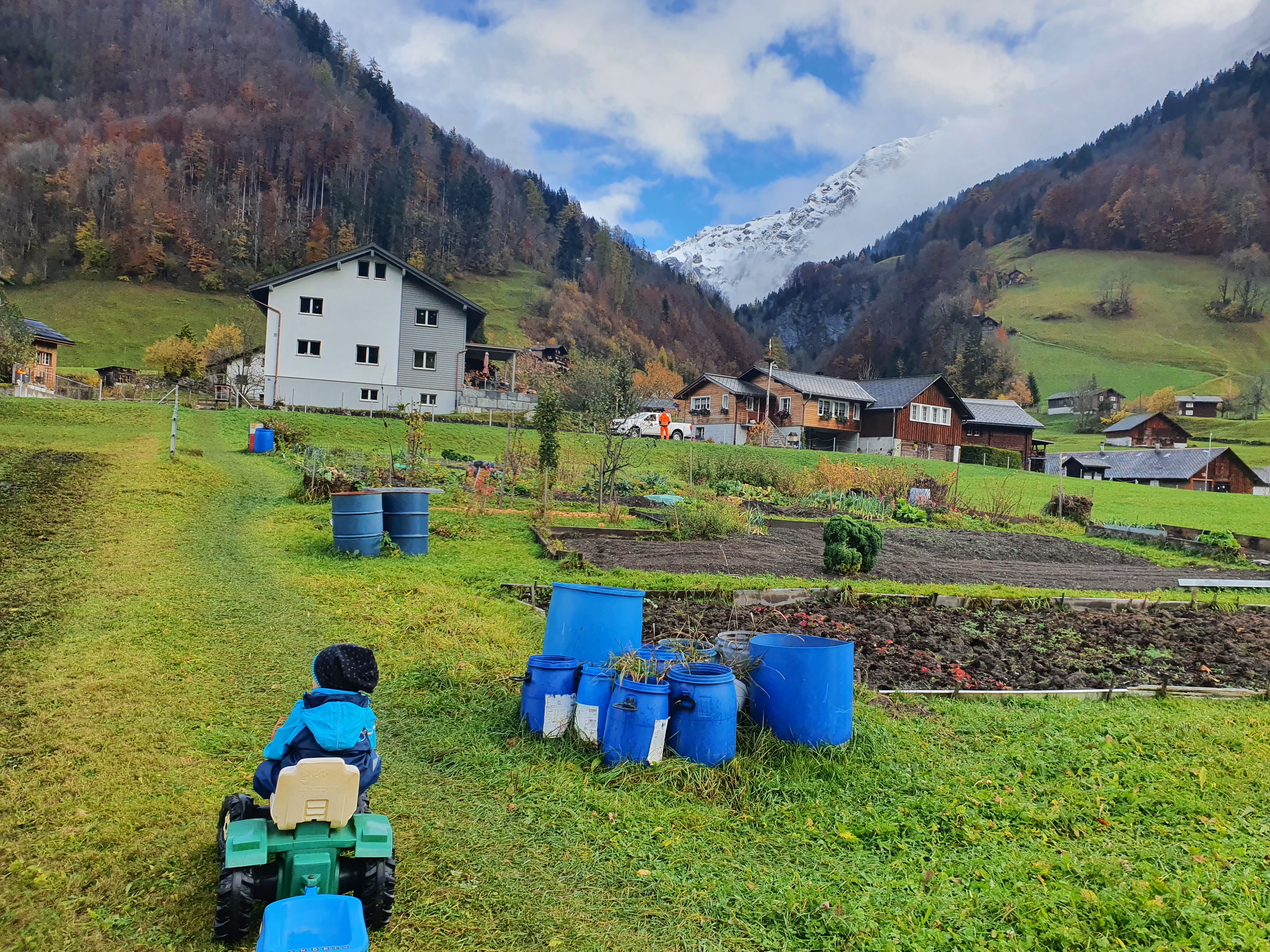 On den sonnigen Tagen waren wir ein paar Stunden im Gemüsegarten, alles noch winterfest machen und aßen dann das Z’Mittag auf der Terasse. So fein all die Sonnenstrahlen einzusammeln. An diesen Tagen brachten Andrin und ich gerne die Decke, den Bauernhof, die Tiere, Zäune und Autos nach draußen um das Wetter komplett auszukosten. Einmal fuhren wir mit dem Bus auch noch nach Elm um dort eine extra Stunde Sonnenschein zu genießen. Das Busfahren an sich ein Höhepunkt!