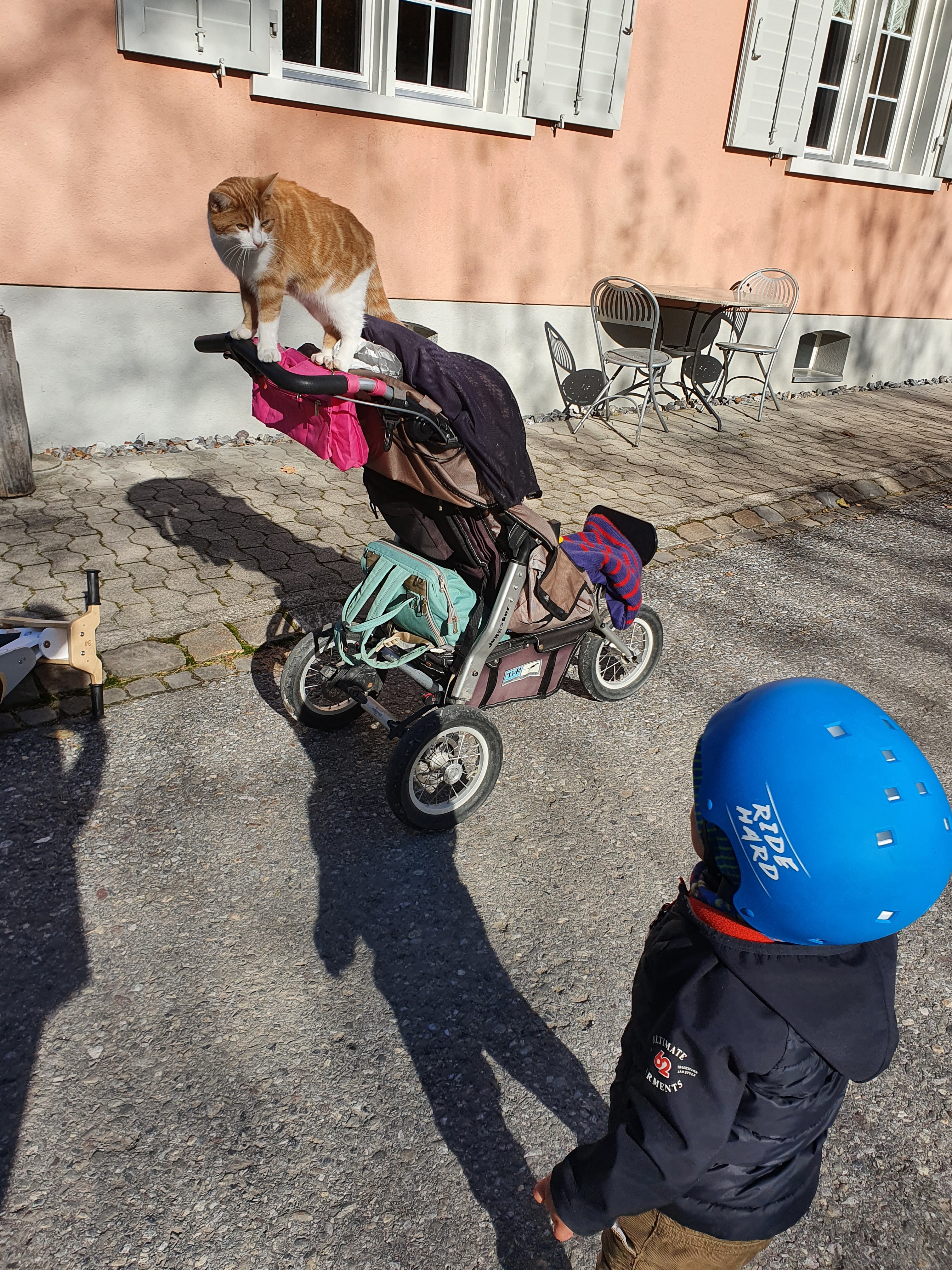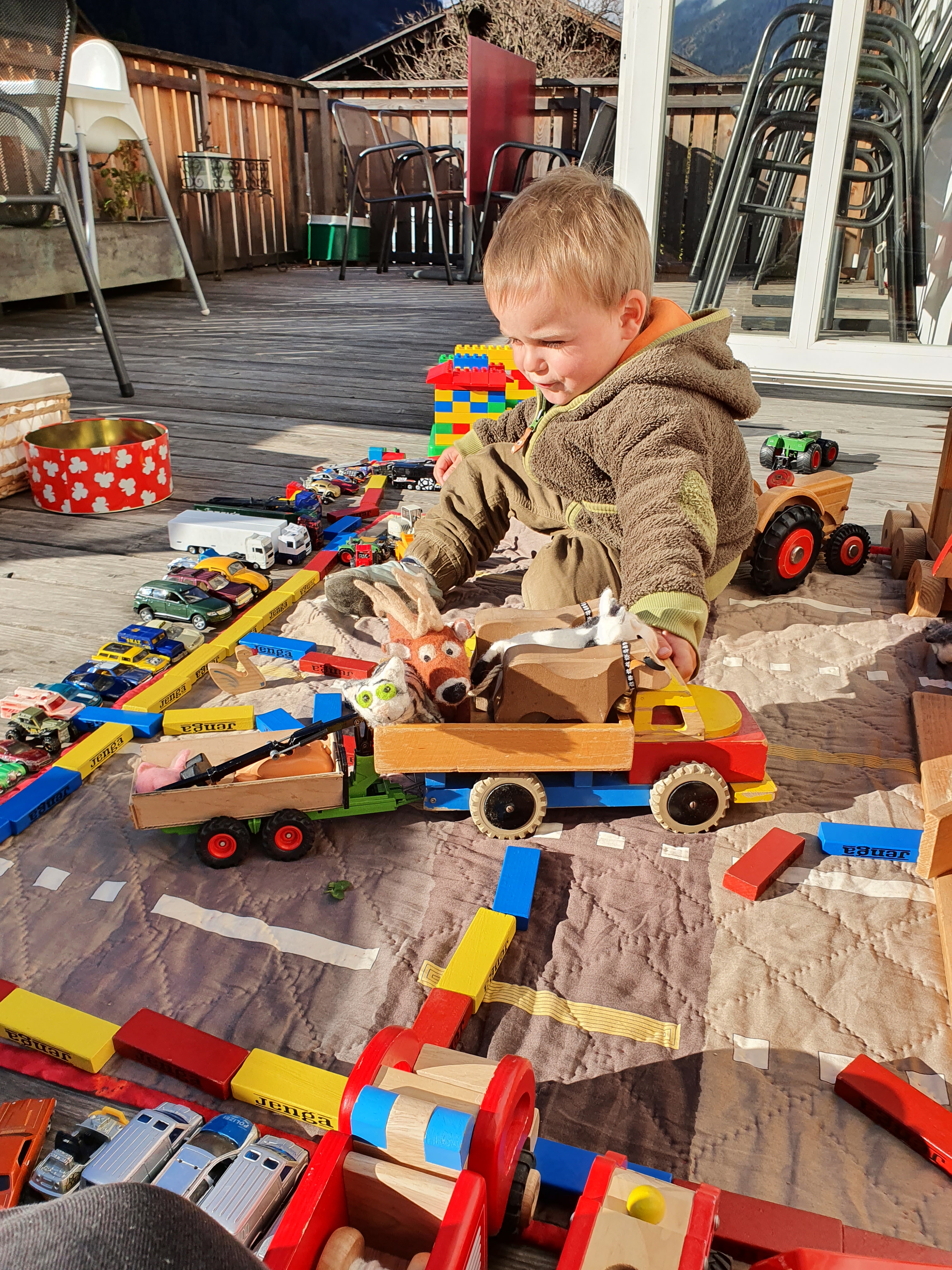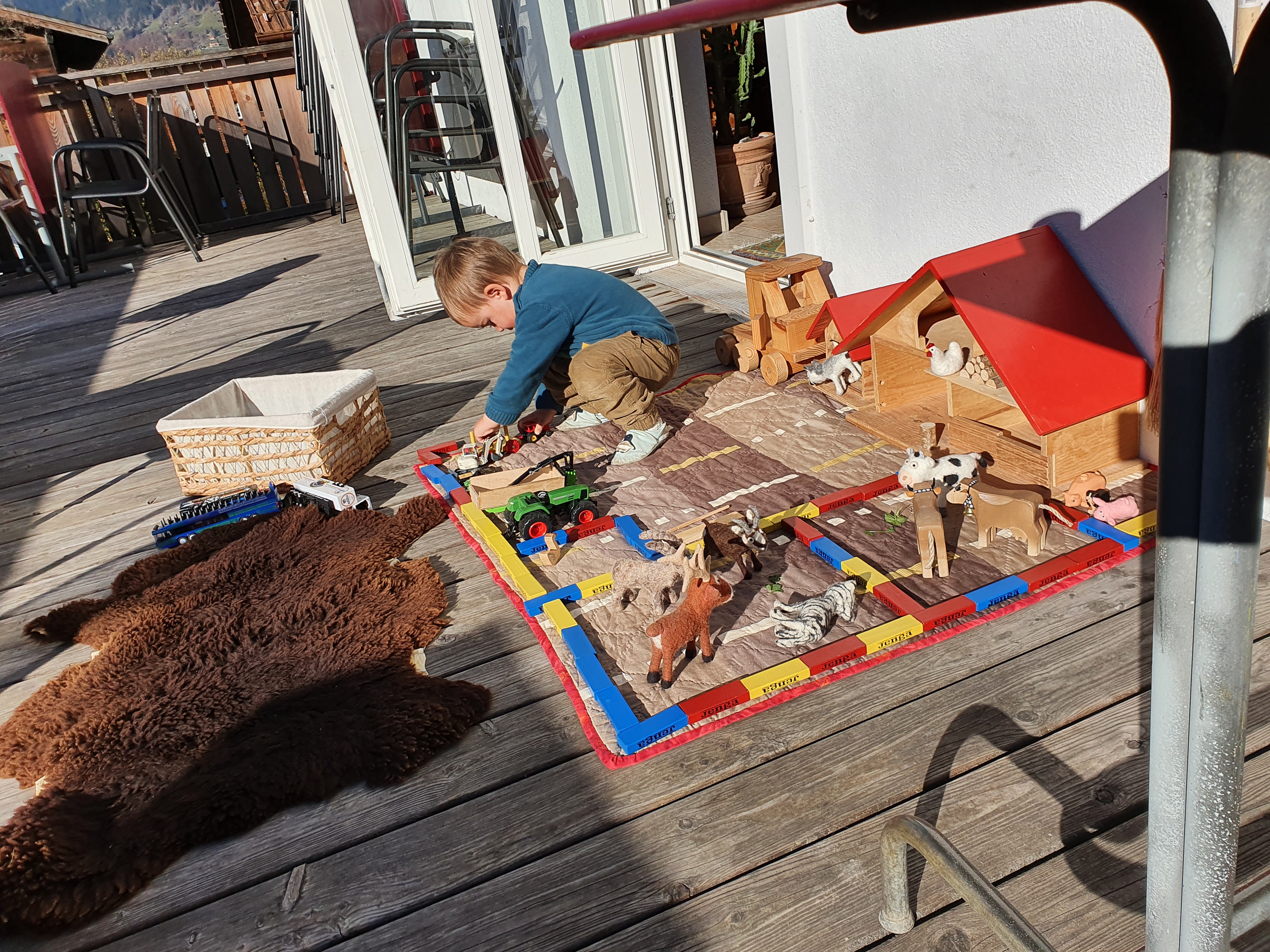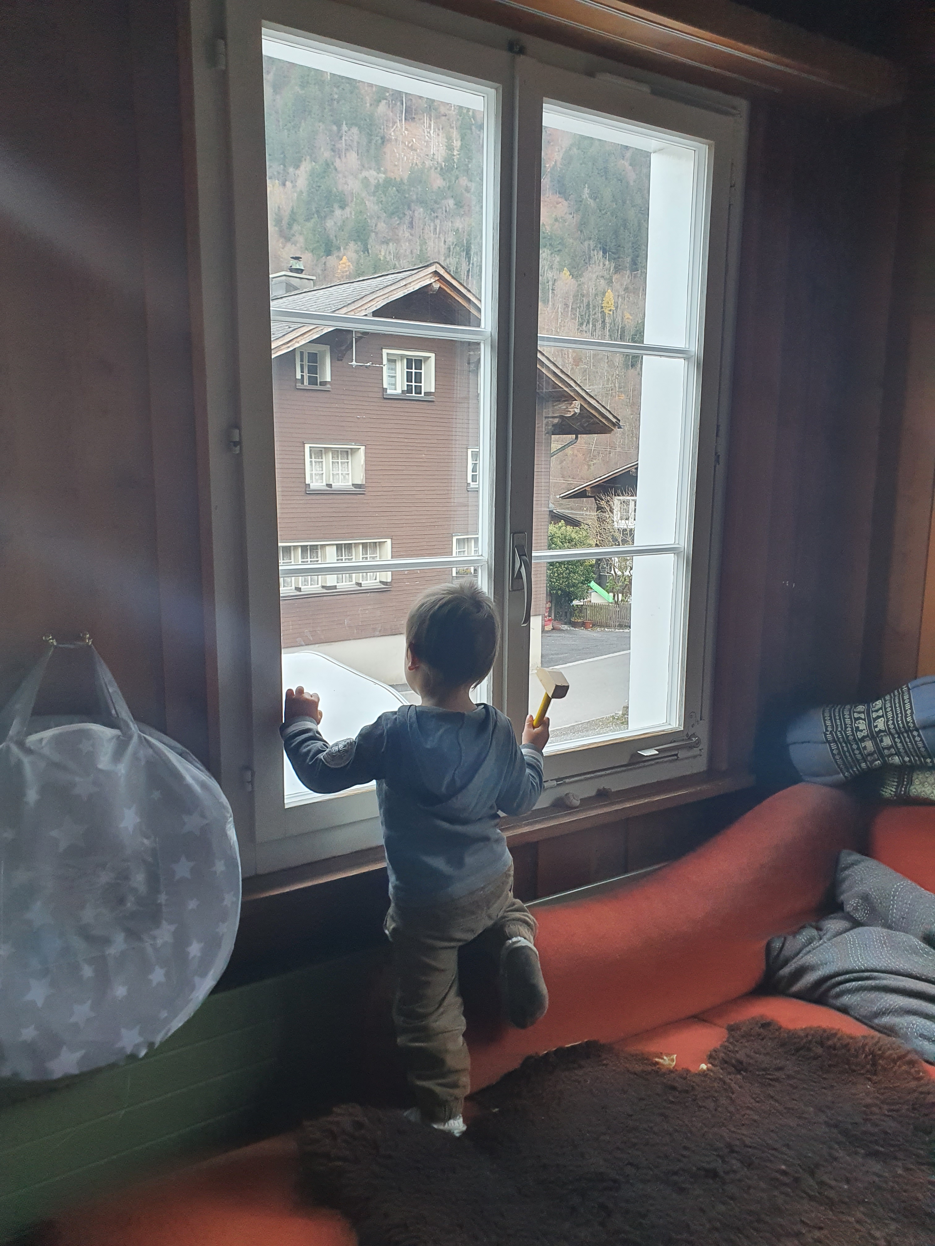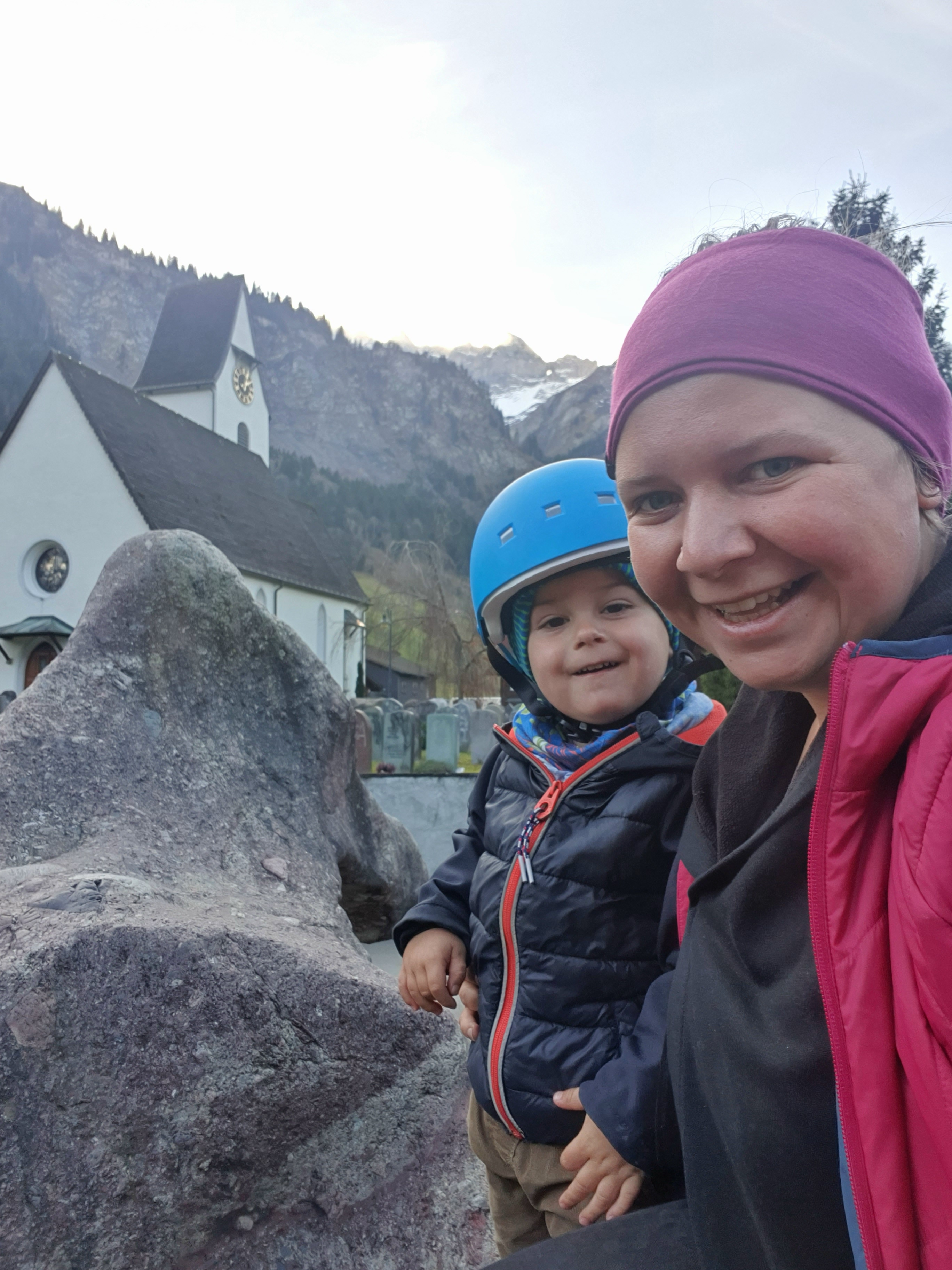 On sunny days we ate lunch outside and Andrin and I would then take the blanket, farmhouse, animals, fences and cars outside to get some more sunshine. The two of us went to the playground in Elm and taking the bus was a highlight, that’s for sure.