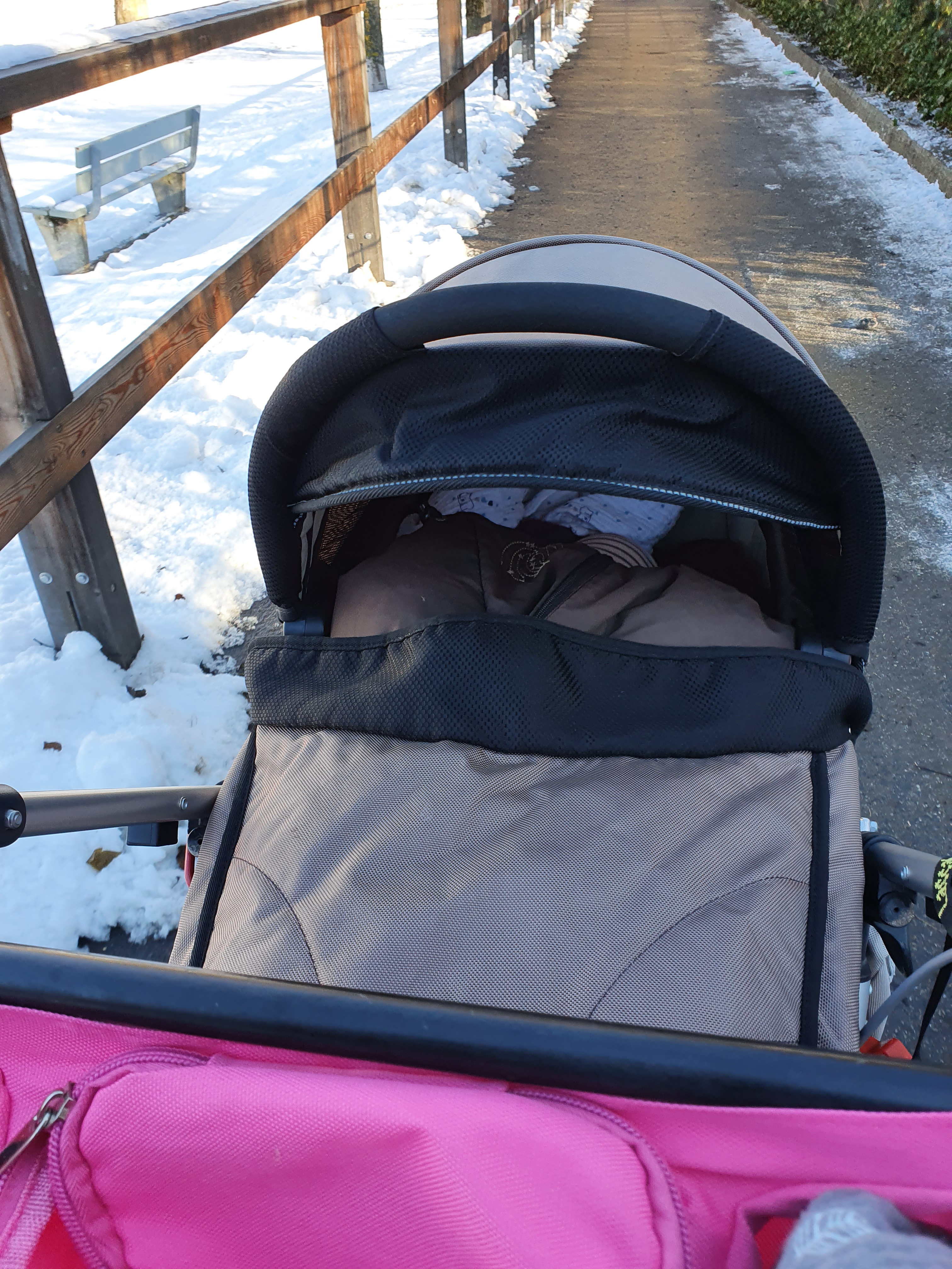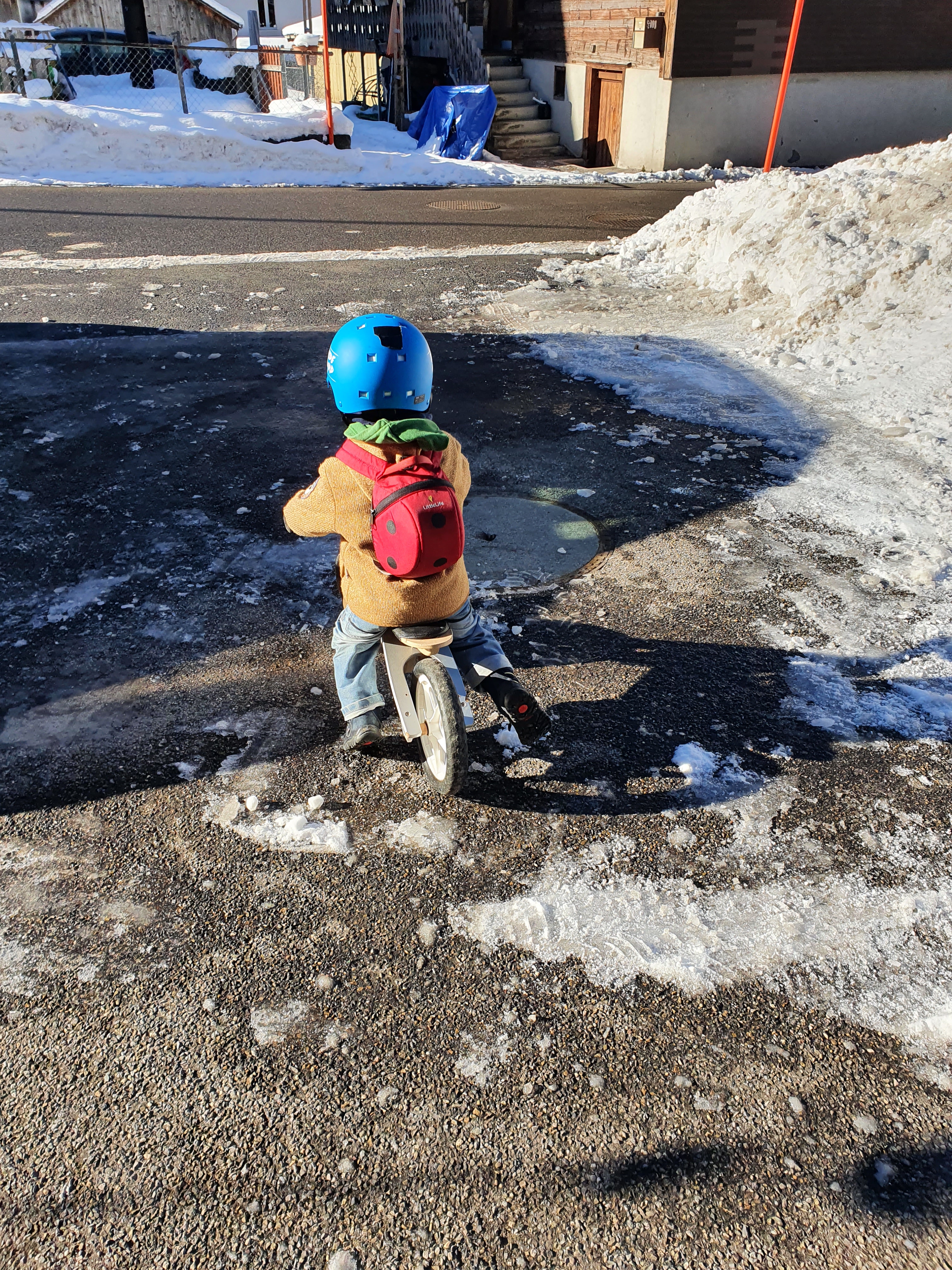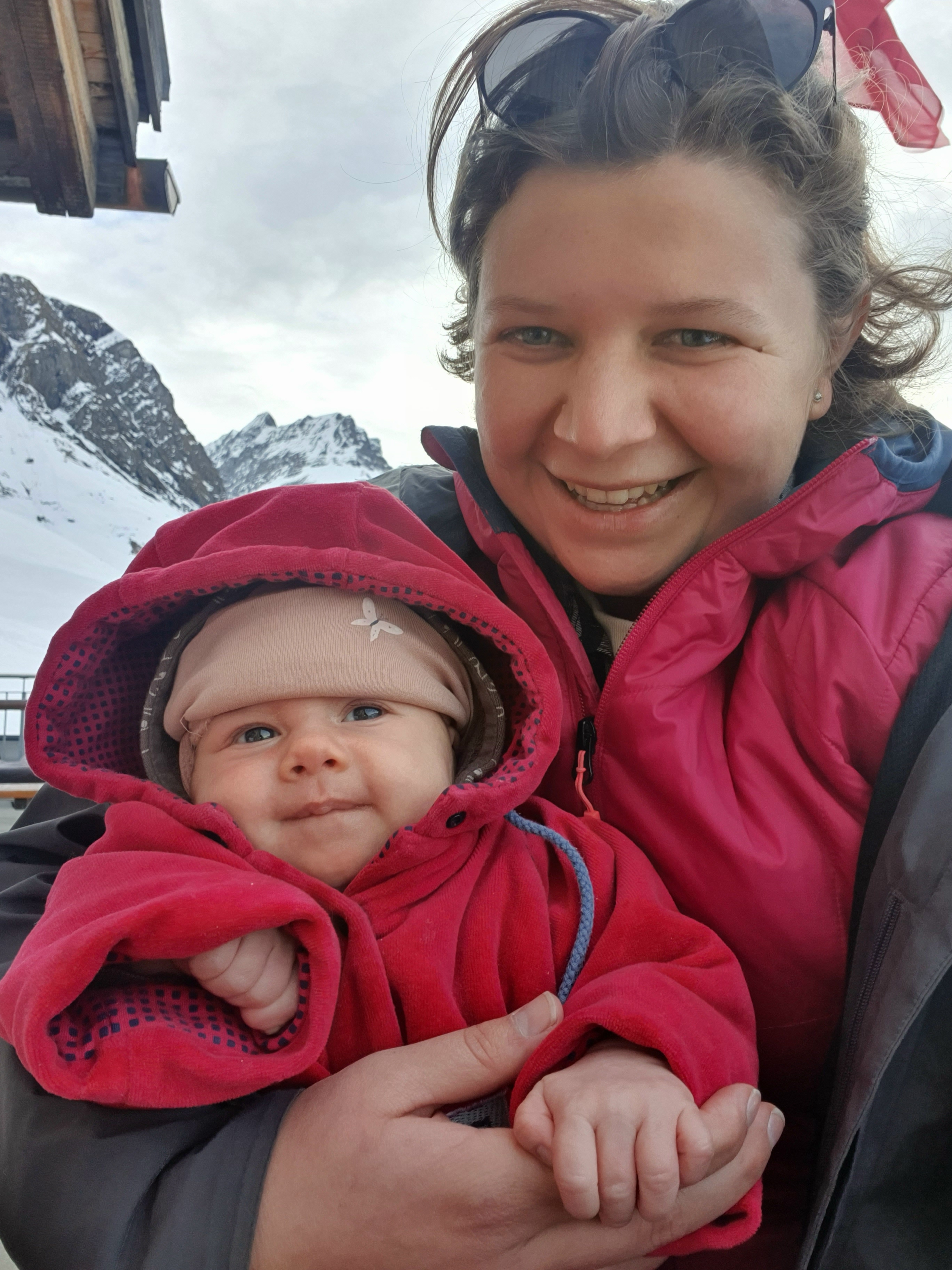 Am 16. wanderten Brigitte, Nicole, Nora, Ina (Janas Freundin) und ich zur Hütte in Obererbs – was für ein atemberaubender Tag auf der Höhe! Im Jänner verbrachte ich dann viel Zeit mit Nora, denn für Andrin war die Umstellung auf Jana und Manu wichtig, und ich genoss es sehr mit ihr spazieren zu gehen, auf dem Sofa zu wippen und mich mit ihr zu unterhalten. Einmal zeigte ich ihr ein Buch und war völlig überrascht als sie animiert zu brabbeln begann – wer hätte gedacht, dass ein zwei Monate altes Kind schon so erzählen und so viel Freude mit Bildern haben würde? Ina war noch hier und so machten Jana, Ina und ich einmal eine kleine Schneeschuhtour auf den Weissenbergen und einen Sauna Nachmittag – wir hatten es hier wirklich gut! An diesem Wochenende packte Florian nochmal sein Velo und stand bei der Talstation der Weissenberge.