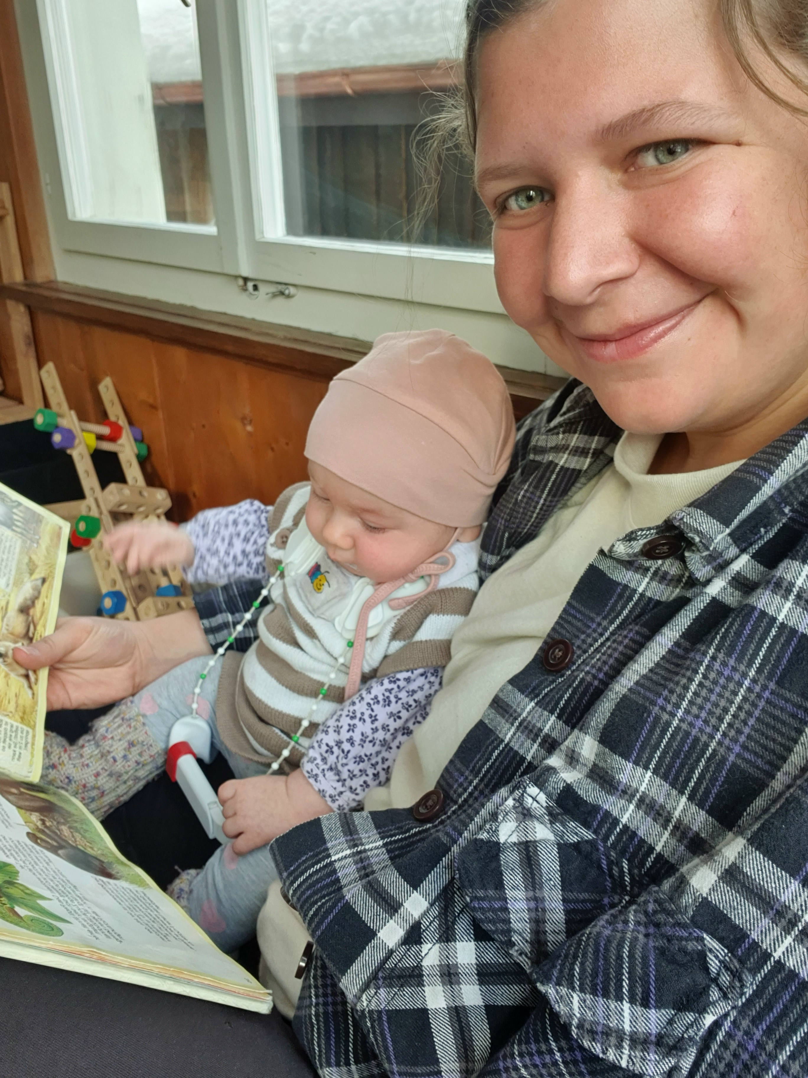 On the 16th Brigitte, Nicole, Nora, Ina (Janas visiting friend) and I hiked up to Obererbs again – what a day it was! I spent a lot of time with Nora in january so Andrin got used to Jana and Manu being here when I was gone. So I went on quite a few walks with her and made an interesting experience: I once held up a book for her “to have something to look at” while I was playing with Andrin and she started babbling like crazy. From then on we showed her books every day.